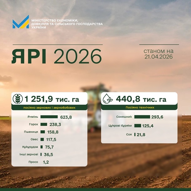 Станом на 20 квітня українські аграрії засіяли понад 1,25 млн гектарів ярих зернових і зернобобових культур, що становить п’яту частину від прогнозованих площ. Про це повідомила пресслужба Міністерства економіки, довкілля і сільського господарства у вівторок, 21 квітня. Зокрема за минулий тиждень аграрії засіяли 254,9 тис. га проти 168,7 тис. га за попередній. Темпи польових робіт зросли у 1,5 раза, проте загальні показники на 15,3% поступаються минулорічним. ![]() Мінекономіки Нині ячменем засіяно 623,8 тис. га (83% від плану), горохом – 238,3 тис. га (87%), пшеницею – 158,8 тис. га (85%) та вівсом – 117,5 тис. га (85%). Сівба кукурудзи активізувалася і досягла 75,7 тис. га (2% від прогнозу), площа під просом становить 1,2 тис. га (3%). Найвищі темпи сівби зернових та зернобобових фіксують в Одеській (168,2 тис. га), Тернопільській (96,3 тис. га), Миколаївській (89,4 тис. га) і Полтавській (86,5 тис. га) областях. На Харківщині вже розпочали сівбу гречки. Паралельно триває сівба технічних культур, якими засіяли 440,8 тис. га. Зокрема, під соняшник відведено 293,6 тис. га (6% від прогнозу), під сою – 21,8 тис. га (1%). Цукровими буряками засіяно 125,4 тис. га, що становить 64% від запланованих площ. Нагадаємо, у більшості регіонів України стан озимих культур оцінюється як задовільний, а потенційна втрата чи необхідність пересіву становить менше 10%. Посівна в Україні стартувала з затримкою< Источник: